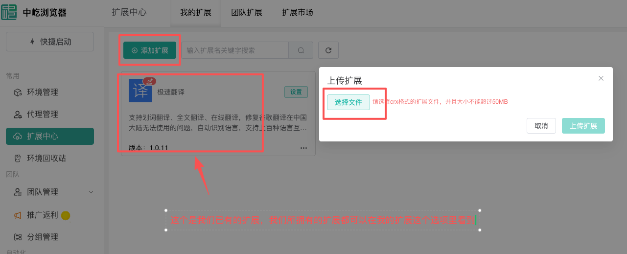 (1)如果我们自己有扩展,可以在我的扩展点击添加扩展,把我们自己的扩展添加进去,同时在我的扩展里可以看到我们以有的扩展