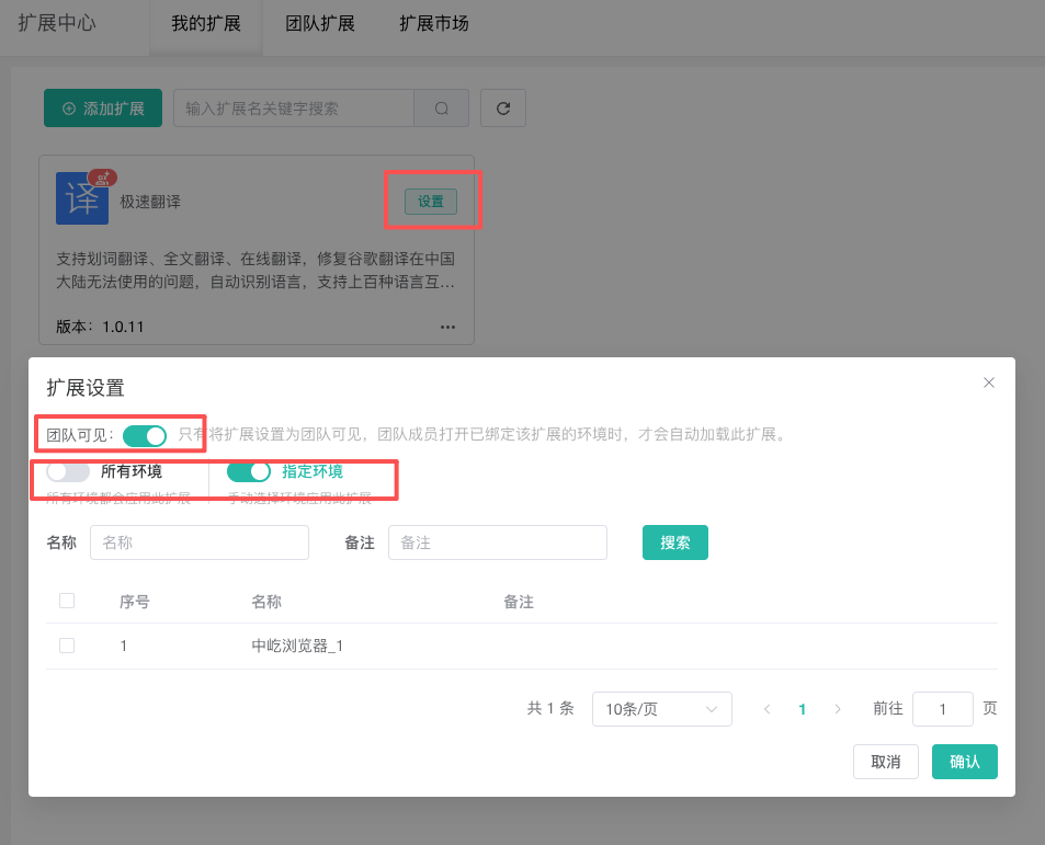 (2)我们在已有的扩展,进行设置。可以设置2个方面,第一个方面我们可以打开团队可见按钮,让我们的团队一起使用这个扩展;第二个方面我们可以指定环境绑定我们的扩展,或者所有的环境都绑定